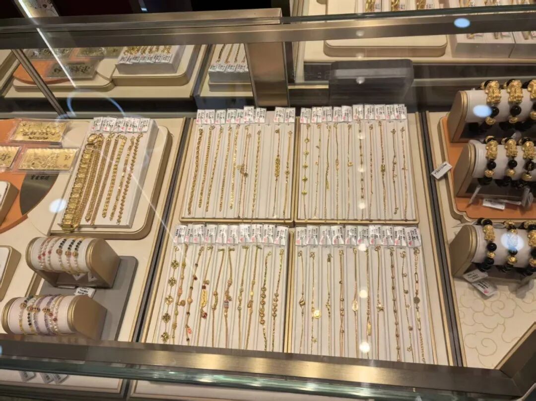 年轻人戴着口罩选金串珠,长辈拉着店员问“今日金价”,连柜台上的“古法金手镯”都贴了“补货中”的标签。