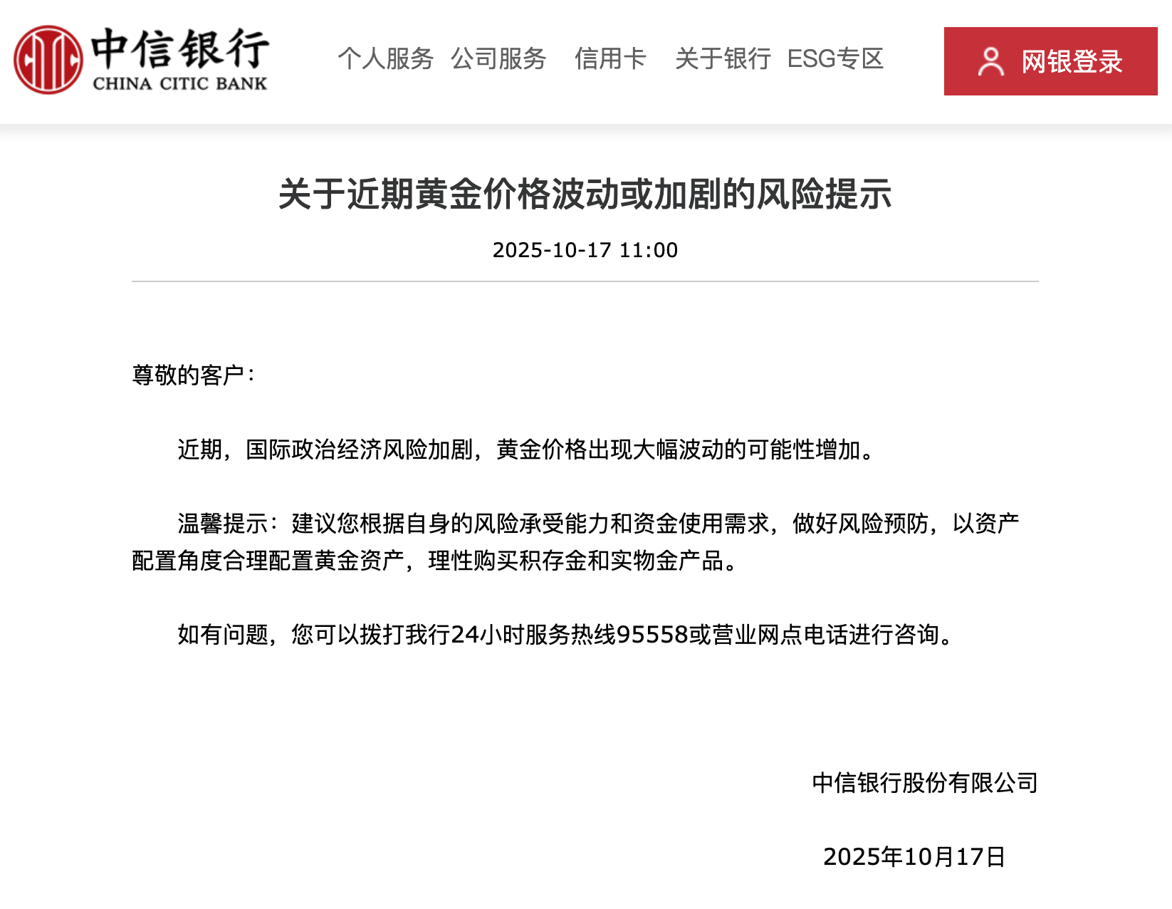 10月17日,中信银行发布关于近期黄金价格波动或加剧的风险提示。近期,国际政治经济风险加剧,黄金价格出现大幅波动的可能性增加。中信银行提示:建议客户根据自身的风险承受能力和资金使用需求,做好风险预防,以资产配置角度合理配置黄金资产,理性购买积存金和实物金产品。